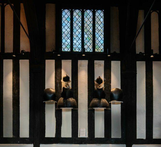 Description: Museum and garden with an 800-year history located alongside a canal in an historic cathedral city. The building displays a range of historic periods, including medieval, Tudor and Georgian and has a medieval Great Hall which is the largest space at the heart of this H-shaped building. The building comprises the medieval Great Hall, 17th-century staircase, medieval Solar room, Tudor wood-panelled rooms, library, medieval painted bedroom, Georgian rooms, Victorian kitchen, and a suite of rooms available for private hire. The exterior, beside the canal and gardens, shows a mixture of black and white timber-framed walls and Georgian facades, cobbled courtyard, walled garden, herb garden, and an outer garden. There is a canal-side café on site, as well as facilities, and parking is available for those filming. A gorgeous, historic location for filming and photography.